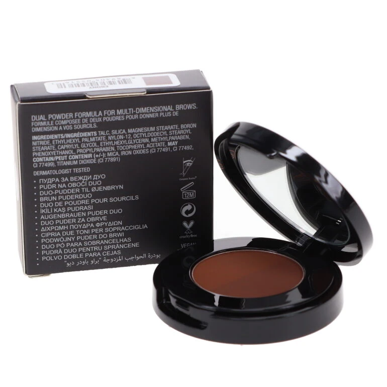 | How To Apply | Use short, light strokes to fill in sparse brows. Apply the powder onto the brow using the Mini Duo Angled Spooley Brush #7. Use the spooley brush to pull the color through. Use both shades of Brow Powder Duo to create an even finish that has natural highlights and lowlights. Apply the darker shade to areas that have little to no hair, and then the lighter shade over both the darker shade and the rest of the brows. |