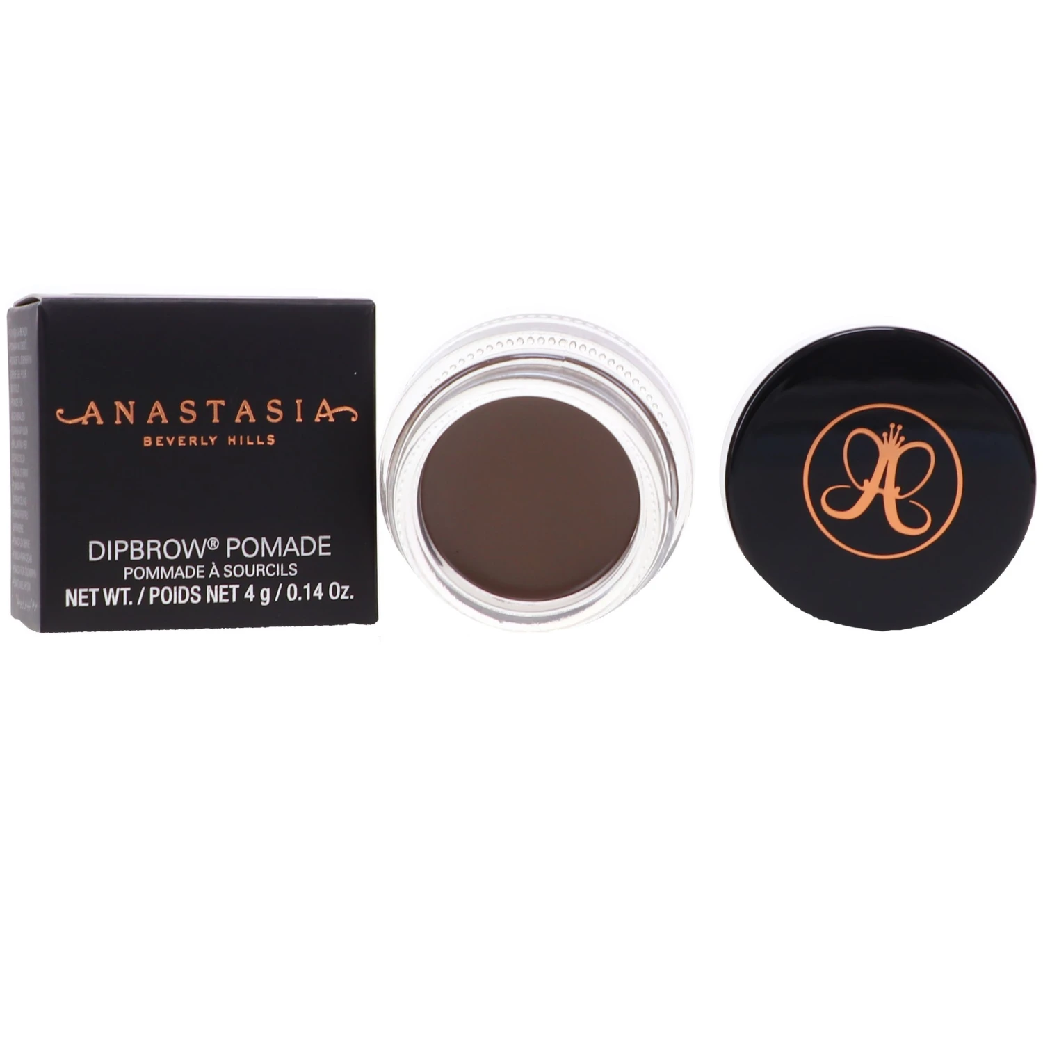 | How To Apply | Dipbrow is best applied with Anastasia Beverly Hills Brush 12, an angled brow brush with short, stiff bristles. You can easily outline and fill a perfect eyebrow. After applying the desired amount of color, be sure to blend with the clean spooley end of Brush 12. Never apply the pomade by directly putting your brush into the pot and applying the product on your brows. To ensure you have the perfect amount needed for application, dip your brush into the pot and swipe it across the inside of the cap – this will allow you to remove excess product, or collect more as-needed. |