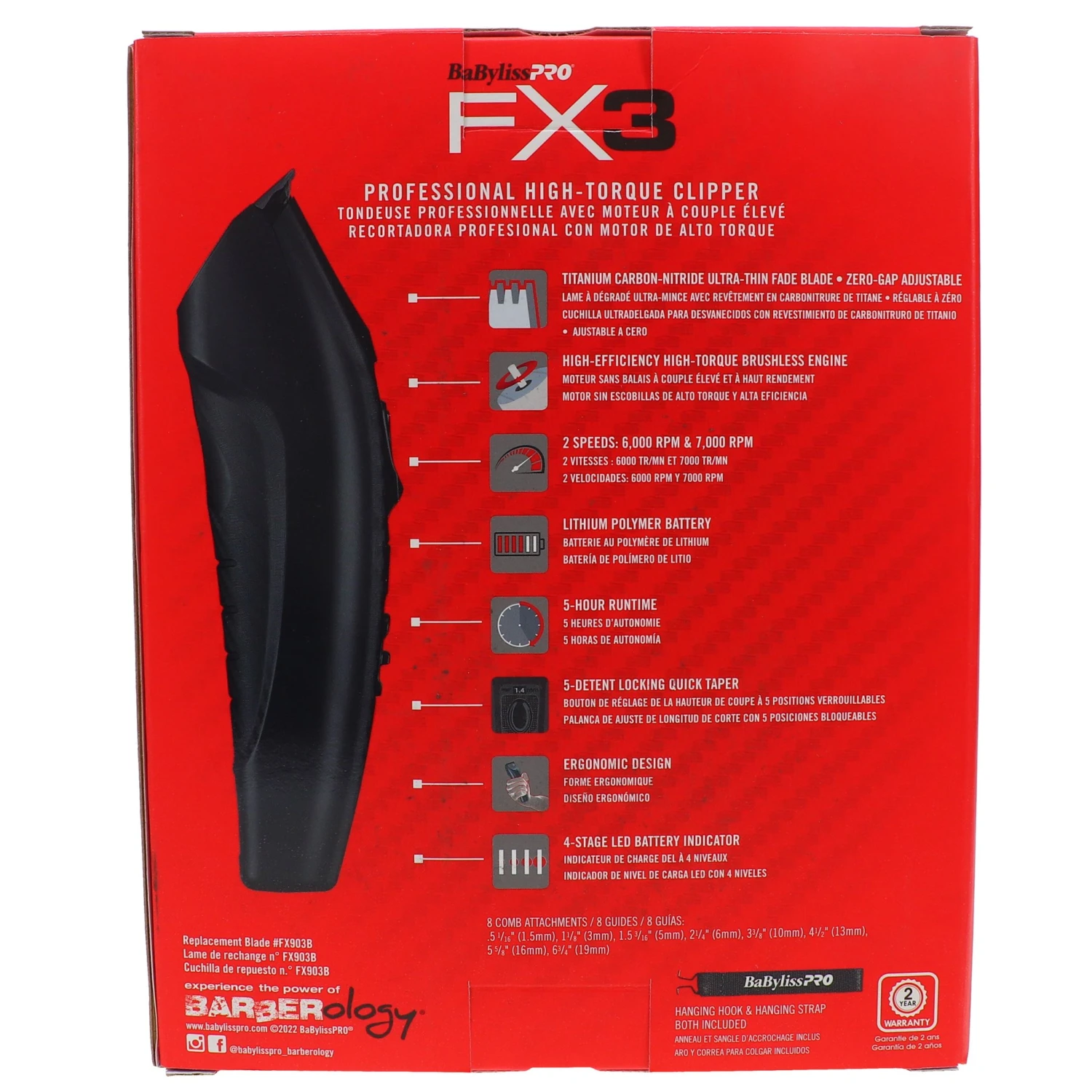 The BaBylissPRO FX3 Professional High Torque Clipper is designed for optimum performance and durability. Featuring a DLC/nickel titanium ultra-thin fade blade, lithium polymer battery, 5 detent locking quick taper, and 2 speeds (6,000 RPM and 7,000 RPM), this clipper is perfect for a variety of haircuts. The ergonomic design and embedded carbon texture grip surface make it comfortable to hold and easy to maneuver. Additionally, the 4 stage LED battery indicator ensures you always have enough power for a great cut. The BaBylissPRO FX3 comes with 8 comb attachments, a hanging strap, and a limited 2-year warranty.