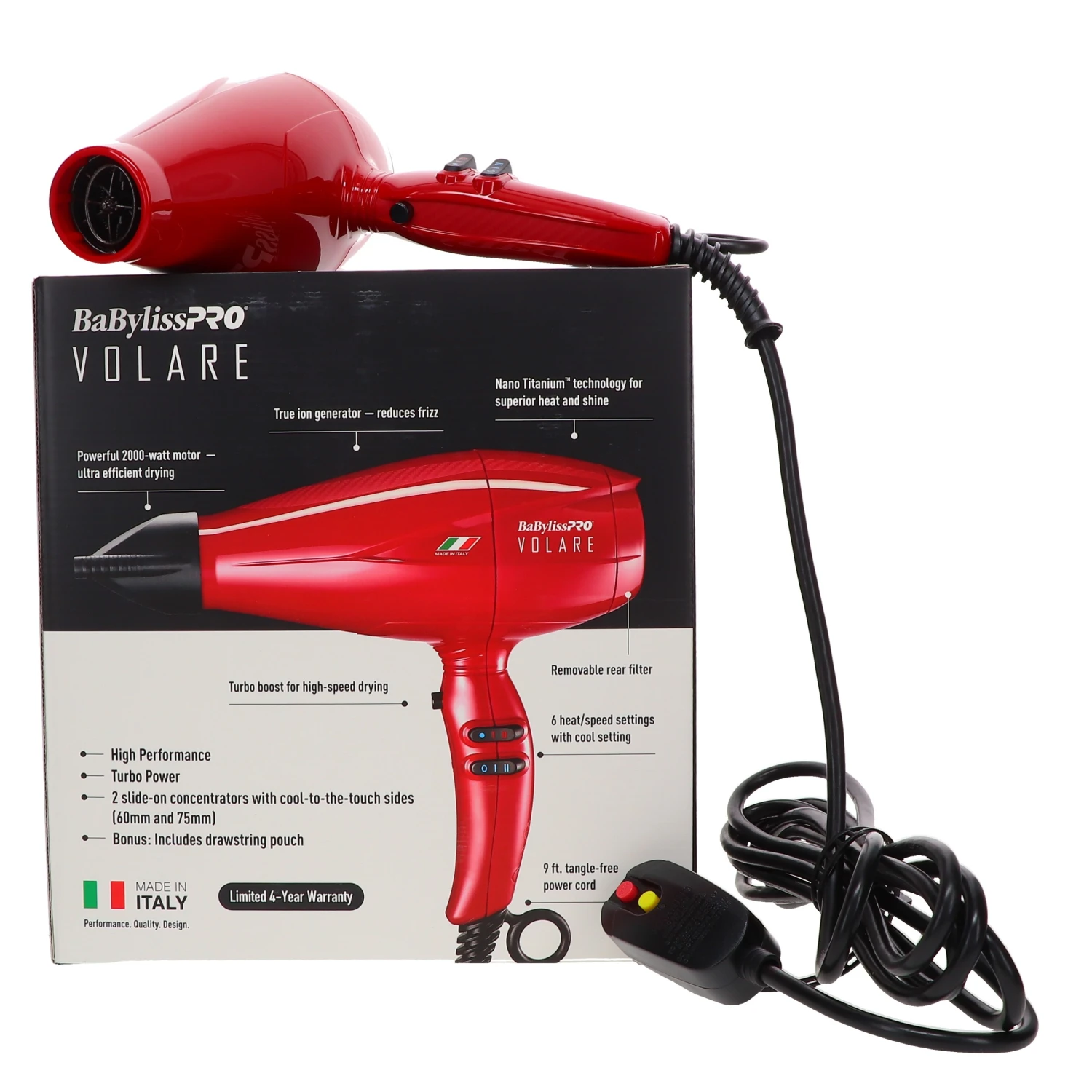 With a Ferrari-designed AC motor, the ultra-efficient Volare V1 takes hair drying to the next level. It delivers intense air pressure for a super quick blow dry. Featuring a nano titanium technology to dry hair to a brilliant new level of shine. At 2000 watts, the nano titanium Volare V1 Full-Size dryer has maximum performance for silky, smooth hair. Choose between 6 heat and speed settings to achieve the desired result. It comes with 2 slide-on concentrator nozzles that help direct the airflow in the targeted area. Made in Italy and built exclusively for professional hairstylists, this dryer is quiet, less disruptive, and durable.