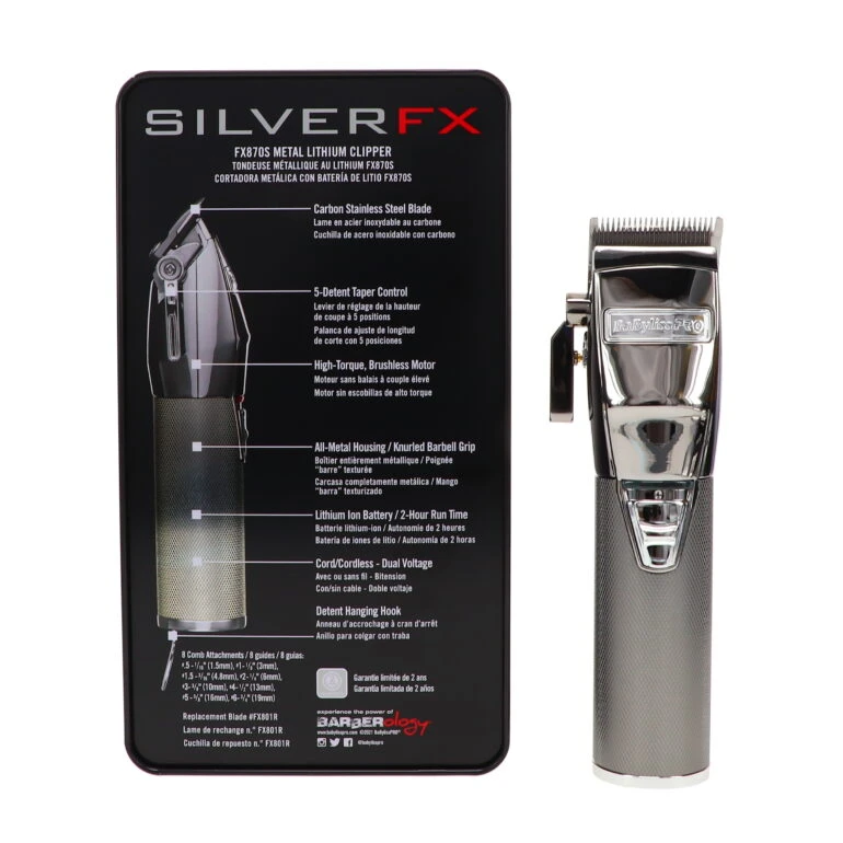SILVERFX Clipper works on all hair textures, and includes 8 comb attachments, with a 5-detent taper control. It has a Ferrari-designed brushless engine, with a cord/cordless lithium ion battery, It has a 2 hour runtime. Its blade is high-carbon stainless steel. It has all-metal housing with a knurled barbell grip. It contains a limited 2 year warranty.