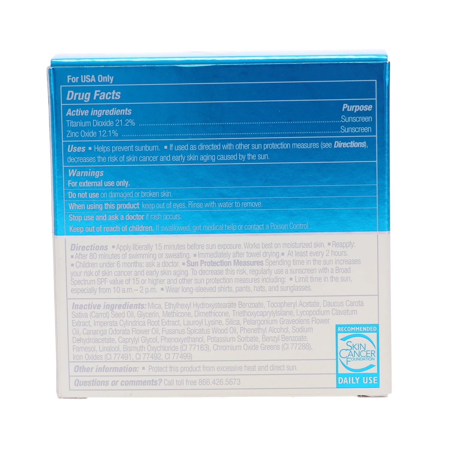 | Ingredients | Titanium Dioxide 21.2%; Zinc Oxide 12.1%, Mica, Ethylhexyl Hydroxystearate Benzoate, Tocopheryl Acetate, Daucus Carota Sativa Seed Oil, Glycerin, Methicone, Dimethicone, Triethoxycaprylylsilane, Lycopodium Clavatum Extract, Imperata Cylindrica Root Extract, Lauroyl Lysine, Silica, Pelargonium Graveolens Flower Oil, Cananga Odorata Flower Oil, Fusanus Spicatus Wood Oil, Phenethyl Alcohol, Sodium Dehydroacetate, Caprylyl Glycol, Phenoxyethanol, Potassium Sorbate, Benzyl Benzoate, Farnesol, Linalool, Bismuth Oxychloride, Chromium Oxide Greens, Iron Oxides |
