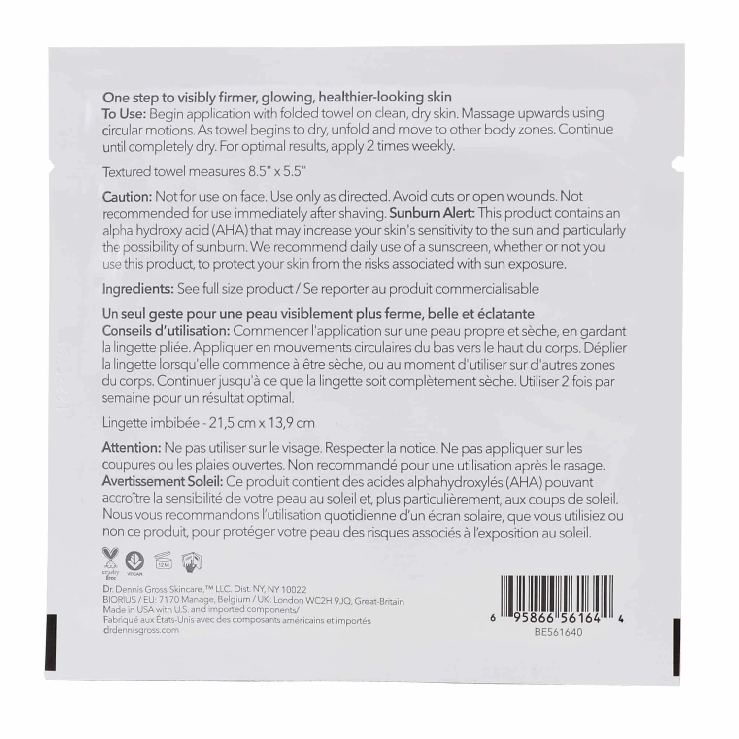 The Dr. Dennis Gross Alpha Beta Exfoliating Body Treatment Peel is the perfect addition to your skincare routine. This all-over body towel comes packed with Alpha Beta acids, enzymes, and bakuchiol to provide a powerful exfoliating experience that lifts away dead skin, helps reduce the visibility of blemishes, bumps and rough patches for softer, brighter skin. Our precise blendnot only provides an effective exfoliation, but also helps increase firmness in the skin for noticeably younger-looking results. Plus our inclusion of antioxidant-rich squalane and aloe work together to soothe and strengthen your skin’s moisture barrier for even more lasting hydration. Experience dramatically smoother texture all over with just one use of this transformative body peel. You’ll immediately start seeing firmer, glowing skin that feels healthier than ever before!