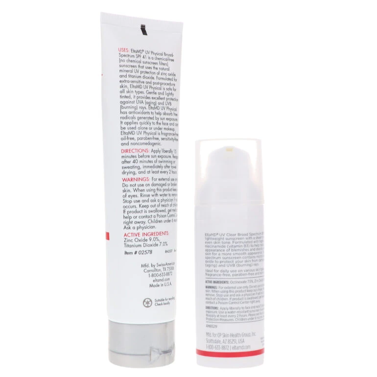 UV Physical Broad Spectrum SPF 41 is a tinted, water-resistant formula packaged in a tube. This chemical-free product blends 9.0% transparent zinc oxide with 7.0% titanium dioxide and can withstand humidity, sweat or water for up to 40 minutes. Both of these Elta MD sunscreens are free of fragrances, oils and parabens and are noncomedogenic.