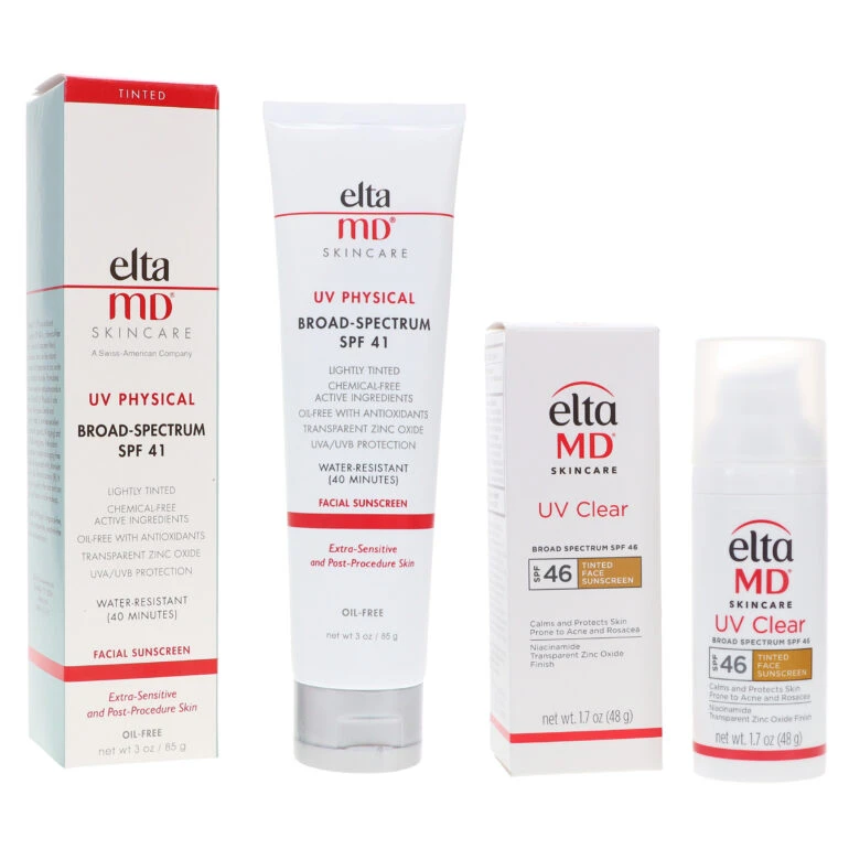 Get two types of tinted sunscreen for face in a set of Elta MD UV Clear SPF 46 Tinted Broad Spectrum Facial Sunscreen 1.7 oz and SPF 41 Lightly Tinted Facial Sunscreen 3 oz. Both of these sun protection products are safe to use on sensitive skin and have light tinting suitable for a broad range of skin tones.