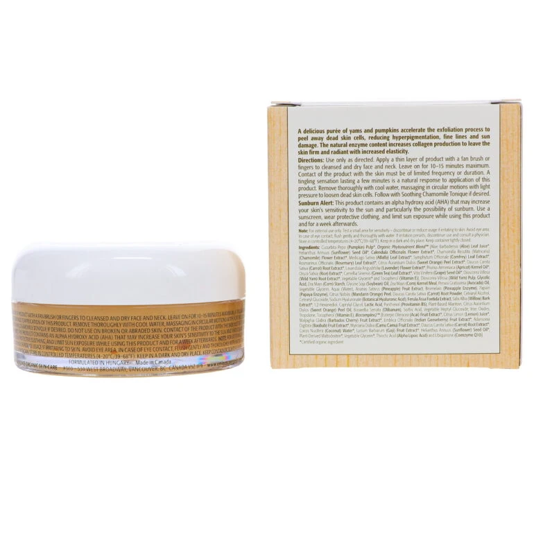 | Ingredients | Organic Phytonutrient Blendâ„¢ [Aloe Juice*, Calendula Officinalis Flower Extract*, Calendula Officinalis Flower Oil*, Chamomile Flower Extract*, Alfalfa Leaf Extract*, Comfrey Leaf Extract*, Sunflower Seed Oil*, Rosemary Leaf Extract*, Sweet Orange Peel Extract*, Carrot Extract*, Lavender Flower Extract*, Apricot Kernel Oil*, Rice Extract*, Green Tea Leaf Extract*, Grape Seed Oil*, Wild Yam Root Extract*, Vegetable Glycerin*, Vitamin E and Vegetable Heptyl Glucoside], Pumpkin Pulp*, Corn Meal, Pineapple Enzyme, Glycolic Acid, Avocado Oil, Vegetable Glycerin, Lactic Acid, Soybean Oil, Yeast Extract (Hyaluronate), Pineapple Fruit Extract, Papaya Enzyme, Ethoxydiglycol, Butylene Glycol, Asafoetida Root Extract, Willow Bark Extract*, Calendula Officinalis Flower Extract, Glyceryl Caprylate, Glyceryl Undecylenate, Mandarin Orange Peel Oil, Allantoin, Provitamin B5, Biocomplex2â„¢ [Acai*, Lemon*, Barbados Cherry*, Indian Gooseberry*, Baobab*, Camu Camu*, Carrot*, Coconut Water*, Goji Berry*, Tapioca Starch (from Cassava Root)*, Alpha Lipoic Acid and Coenzyme Q10], Vegetable Glycerin*, Olibanum*. |