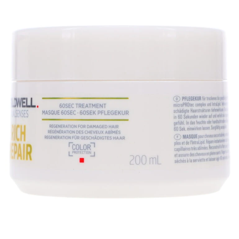 Looking for a quick and easy way to restore dry, damaged hair? Look no further than Goldwell Dualsenses Rich Repair 60 Sec Treatment! This unique formula is blended with microPROtec complex and IntraLipid to instantly repair severely damaged hair structures from deep inside. In just 60 seconds, it will rebuild your hair fiber up to 100%, leaving you with healthy-looking and feeling hair. Plus, itβs easy to use β just apply to towel-dried hair and massage in for 1 minute before rinsing out. Try Goldwell Dualsenses Rich Repair 60 Sec Treatment today and see the difference!