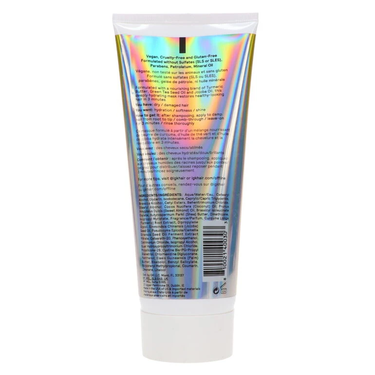 Introducing the IGK Offline 3-Minute Hydration Hair Mask. This deeply nourishing hair mask is perfect for restoring dry, damaged hair back to health in just 3 minutes. Formulated with turmeric butter and green tea seed oil, it intensely conditions hair without weighing it down, while adding shine and smoothness. It also helps to prevent future damage, making it a great choice for those seeking vegan and cruelty-free hair care options. So why wait? Give your hair the nourishment it deserves with the IGK Offline 3-Minute Hydration Hair Mask today!