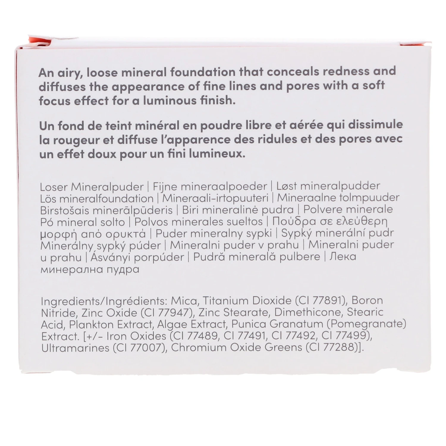 | Ingredients | Active Ingredients: Titanium Dioxide 14%, Zinc Oxide 6%. Ingredients: Mica, Boron Nitride, Zinc Stearate, Dimethicone, Stearic Acid, Plankton Extract, Algae Extract, Punica Granatum (Pomegranate) Extract. May Contain: Iron Oxides (Ci 77489, Ci 77491, Ci 77492, Ci 77499), Ultramarines (Ci 77007), Chromium Oxide Greens (Ci 77288) |