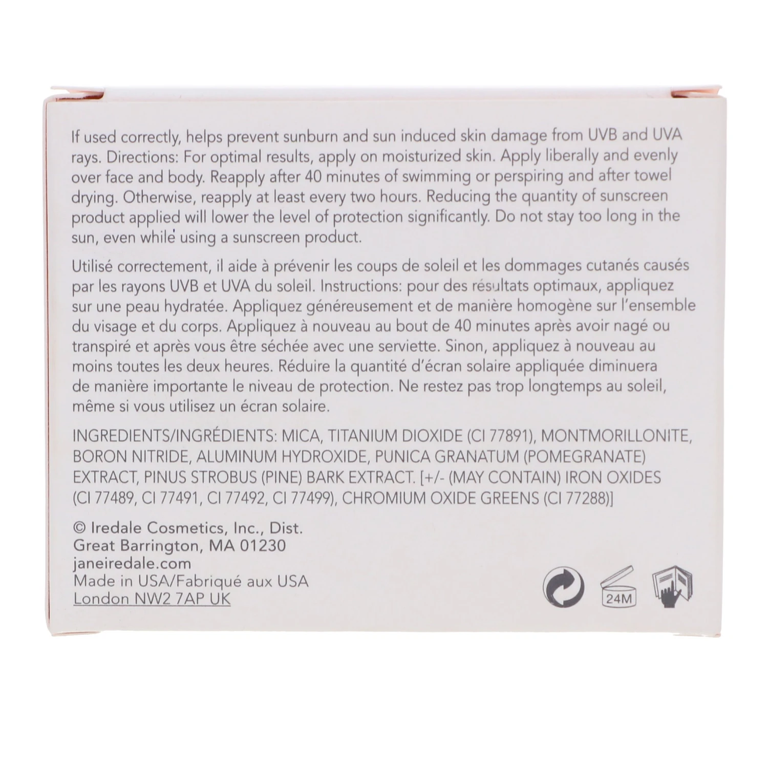 | Ingredients | Active: Titanium Dioxide 17%. Ingredients: Mica, Montmorillonite, Boron Nitride, Aluminum Hydroxide, Punica Granatum (Pomegranate) Extract, Pinus Strobus (Pine) Bark Extract. (May Contain) Iron Oxides (CI 77489, CI 77491, CI 77492, CI 77499), Chromium Oxide Greens (CI 77288). |
