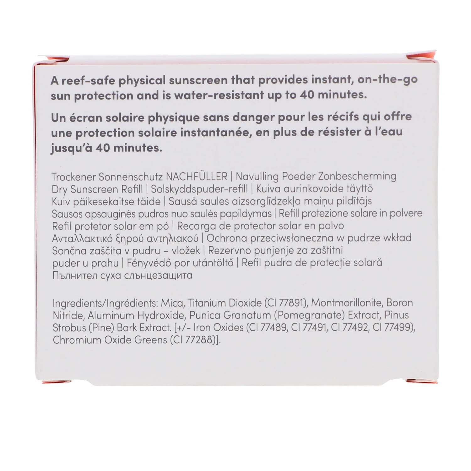 | Ingredients | Active: Titanium Dioxide 17%. Ingredients: Mica, Montmorillonite, Boron Nitride, Aluminum Hydroxide, Punica Granatum (Pomegranate) Extract, Pinus Strobus (Pine) Bark Extract. (May Contain) Iron Oxides (CI 77489, CI 77491, CI 77492, CI 77499), Chromium Oxide Greens (CI 77288). |