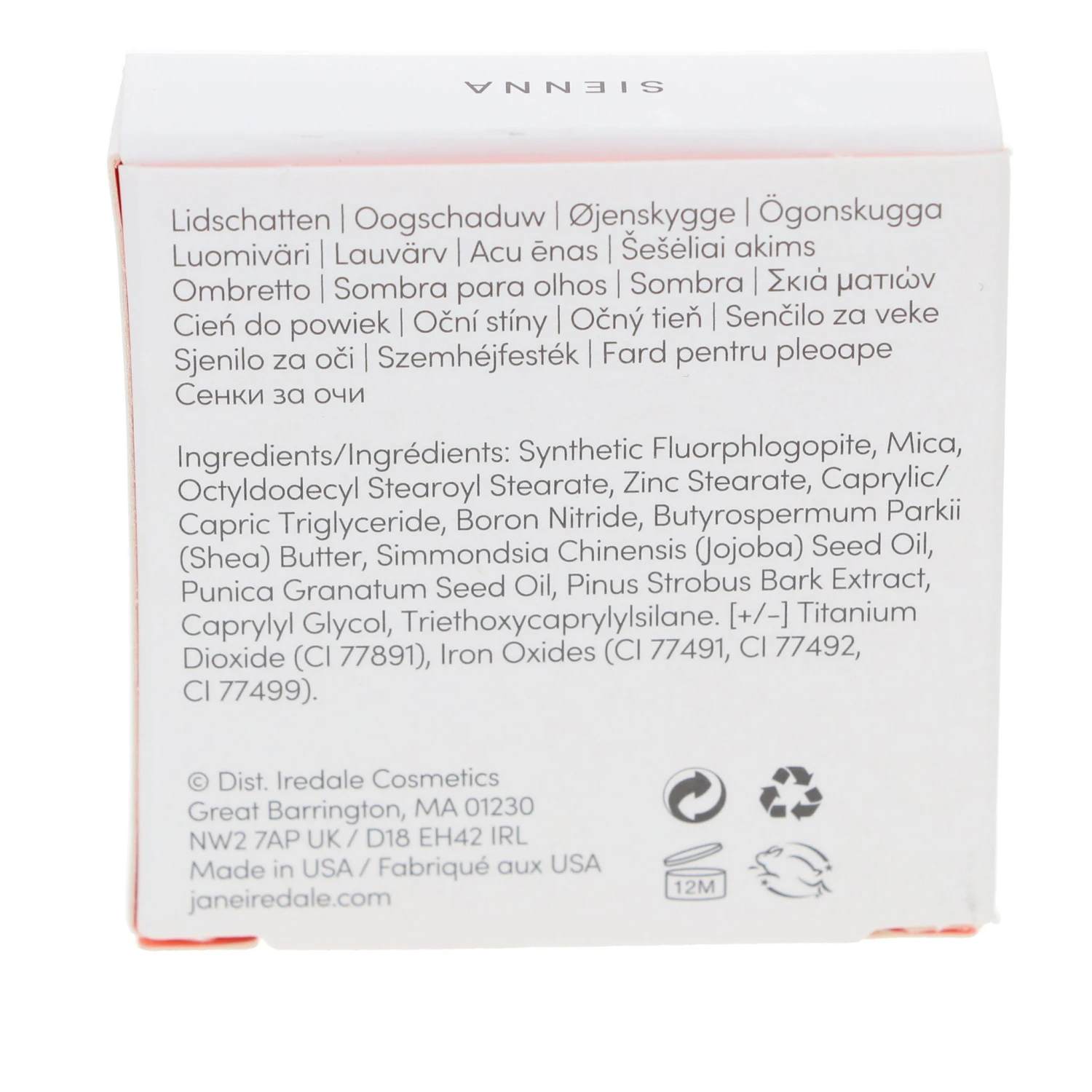 | Ingredients | Synthetic Fluorphlogopite, Mica, Octyldodecyl Stearoyl Stearate, Butyrospermum Parkii (Shea) Butter, Caprylic/Capric Triglyceride, Boron Nitride, Simmondsia Chinensis (Jojoba) Seed Oil, Punica Granatum Seed Oil, Pinus Strobus Bark Extract, Caprylyl Glycol, Zinc Stearate. [+/-Titanium Dioxide (CI 77891), Iron Oxides (CI 77491, CI 77492, CI 77499)]. |