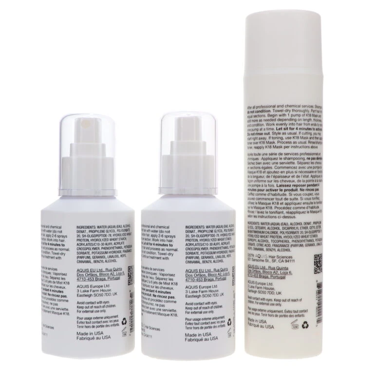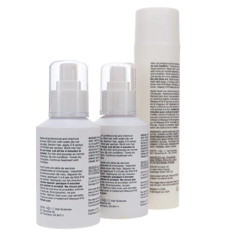 | How To Apply | 1 β Turn PRO mist trigger to "on" position. 2 β Prior to your service, mist hair with water (do not saturate). 3 β Section dry hair into 4 quadrants 4 β Apply 6-12 sprays of K18 PRO mist per quadrant based on length and density 5 β Let sit for 4 minutes. Do not rinse out. 6 β Dry hair if needed, then perform desired chemical service. 7 β Shampoo, do not condition. 8 β Towel-dry thoroughly. 9 β Begin with 1 pump of K18 PRO mask and add more as needed depending on length, thickness, and condition. Work evenly into hair from ends to roots, one pump at a time, maximum dosage is 3 pumps. 10 β Let sit for 4 minutes to activate. Do not rinse out. 11 β Then comb, add product + style as usual. 12 β Use for the first 4-6 washes, then as needed. |