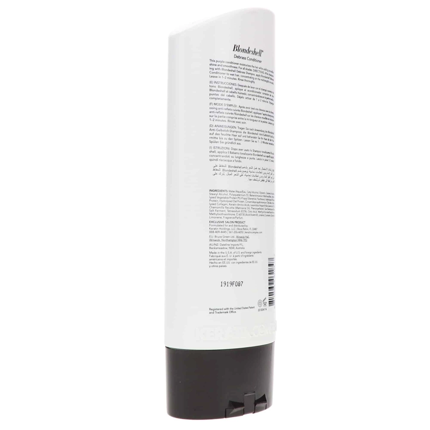 Wash hair with Keratin Complex Blondeshell Debrass Shampoo and rinse. Work Blondeshell Debrass Conditioner through hair and leave on for one to two minutes before rinsing. When used together, these treatments should prevent blonde hair from yellowing. These potent products are best suited for blonde, gray or silver shades and are gentle enough to be used every day.