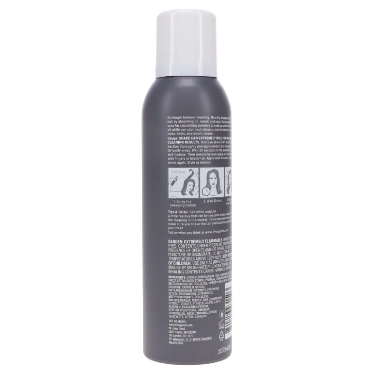 | How To Apply | Shake well. Hold canister 6 to 10 inches away from dry hair, then apply Dry Shampoo section by section in a sweeping motion to dirty or oily areas. Wait 30 seconds for powders to activate and cleanse, then remove them by massaging your hair with your fingers, or brushing your hair. Apply more if needed (just make sure to shake the can again). |