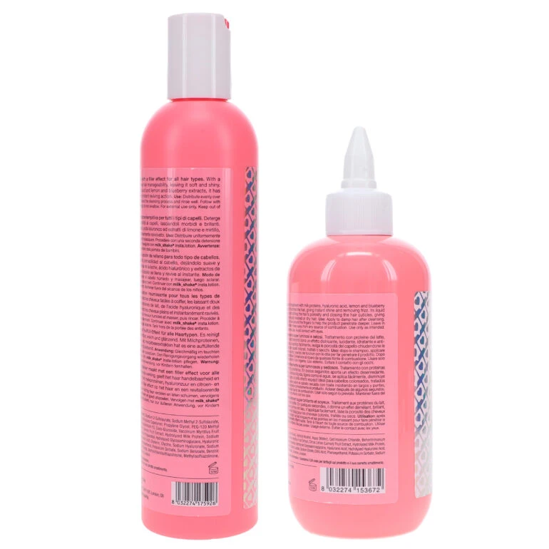 | Ingredients | shampoo: Aqua (water), Disodium 2-Sulfolaurate, Sodium Methyl 2-Sulfolaurate, Cetyl Betaine, Styrene/Acrylates Copolymer, Propylene Glycol, PEG-120 Methyl Glucose Trioleate, Polyquaternium-10, Coco-Glucoside, Vaccinium Myrtillus Fruit Extract, Citrus Limon (Lemon) Fruit Extract, Hydrolyzed Milk Protein, Sodium Hyaluronate Crosspolymer, Propanediol, Hydrolyzed Glucoasminoglycans, Hyaluronic Aci,d Hydrolyzed Hyaluronic Acid, Glycerin, Glycine, Sodium Hyaluronate, Sodium Lactate, Sodium Citrate, Citric Acid, Phenoxyethanol, Potassium Sorbate, Sodium Benzoate, Benzoic Acid, Magnesium Nitrate, Magnesium Chloride, Methylchloroisothiazolinone, Methylisothiazolinone, Parfum (Fragrance), Citronellol, Limonene, Linalool. lotion: Propylene Glycol, Alcohol Denat., Myristyl Alcohol, Aqua (Water), Cetrimonium Chloride, Behentrimonium Chloride, Dicaprylyl Carbonate, Vaccinium Myrtillus Fruit Extract, Citrus Limon (Lemon) Fruit Extract, Hydrolyzed Milk Protein, Sodium Hyaluronate Crosspolymer, Propanediol, Hydrolyzed Glycosaminoglycans, Hyaluronic Acid, Hydrolyzed Hyaluronic Acid, Glycerin, Glycine, Sodium Hyaluronate, Sodium Lactate, Sodium Citrate, Citric Acid, Phenoxyethanol, Potassium Sorbate, Sodium Benzoate, Parfum (Fragrance), Citronellol, Limonene, Linalool. |