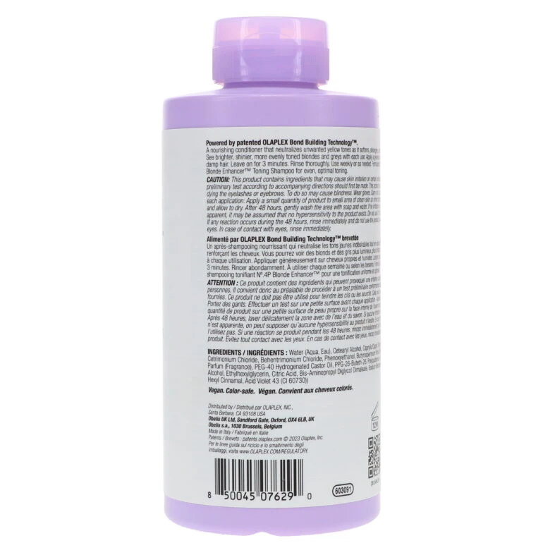 Enhance and perfect the vibrancy of your blonde hair with Olaplex No. 5 Bond Maintenanceâ„¢ Blonde Enhancer Toning Conditioner. This dynamic product is specifically formulated to restore cool tones in blonde and gray hair, giving it a bright and revitalized finish. Not only does it tone your locks, it also utilizes our patented OLAPLEX Bond Building Technologyâ„¢ to strengthen and protect the hair from future damage.