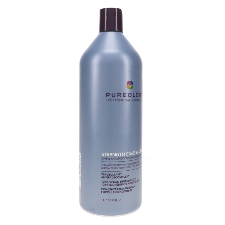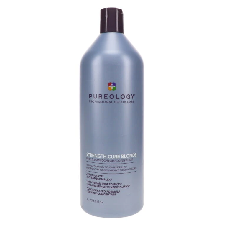 For brighter blonde, use Pureology Strength Cure Best Blonde Purple Shampoo 33.8 oz size. This hair conditioner has a purple hue that coats the hair shaft to get rid of brassiness and yellow tones in blonde, white or highlighted hair. The AntiFade Complex in Strength Cure Best Blonde Shampoo works to preserve your color, while the deep purple toner makes your hair shine with vitality. Natural oils and minerals gently lift away the dirt and grime that collect on blonde hair, making it look dingy and dull, and revitalize your hairβs general condition.