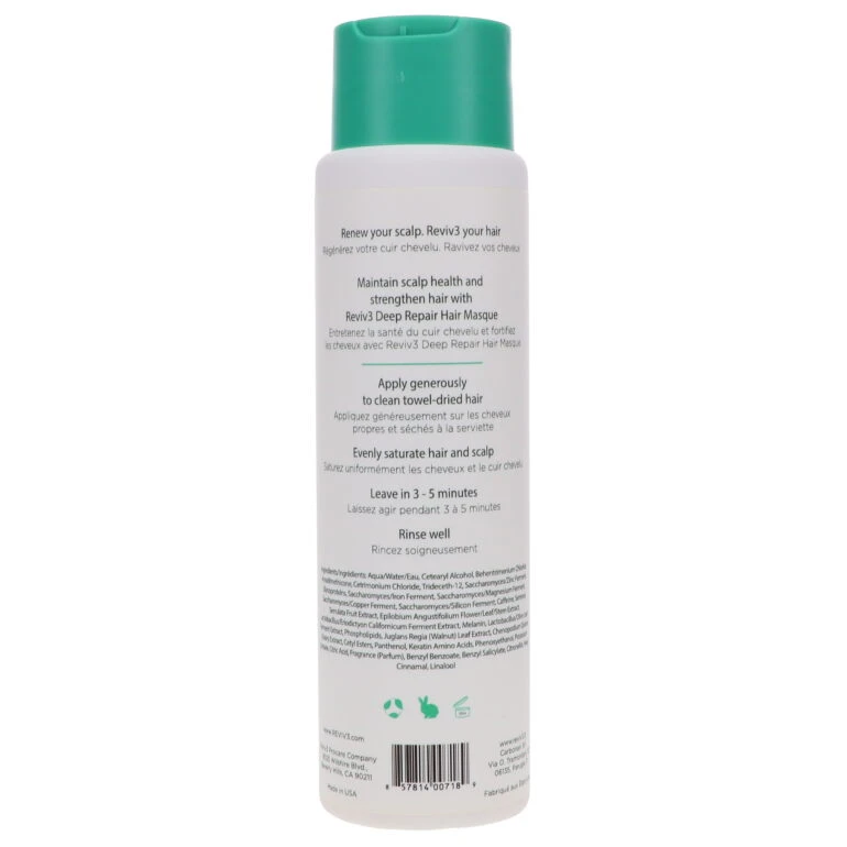 | How To Apply | Apply a generous amount of Mend into the palm of your hands. Gently massage the hair masque treatment into your scalp and hair. Begin with the roots and work the masque through the full length of your hair. Leave on for 5 minutes before thoroughly rinsing your hair.Follow with REVIV3 TREAT Micro-Activ3 Treatment if you are concerned about hair loss or thinning. TREAT is a leave-in treatment and should be applied after a shower and does not require a rinse. |