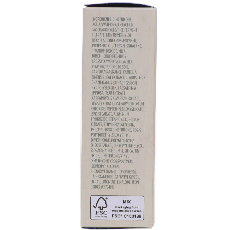| Ingredients | Cyclopentasiloxane, Aqua/Water/Eau, Glycerin, Saccharomyces/Camellia Sinensis Leaf/Cladosiphon Okamuranus/Rice Ferment Filtrate*, Hdi/Trimethylol Hexyllactone Crosspolymer, Propanediol, Dimethicone, Ceresin, Titanium Dioxide, Squalane, Dimethicone/Peg-10/15 Crosspolymer, Sericin, Hydrolyzed Silk, Silk Powder, Caesalpinia Spinosa Fruit Extract, Kappaphycus Alvarezii Extract, Yeast Extract, Distearyldimonium Chloride, Trimethylsiloxysilicate, Zinc Stearate, Aluminum Hydroxide, Stearic Acid, Ethylhexylglycerin, Peg/Ppg-18/18 Dimethicone, Peg-9 Polydimethylsiloxyethyl Dimethicone, Polyglyceryl-2 Diisostearate, Biosaccharide Gum-4, Disodium Edta, Silica, Dimethicone/Vinyl Dimethicone Crosspolymer, Parfum/Fragrance, Isopropyl Alcohol, Phenoxyethanol, Mica (Ci 77019), Tin Oxide (Ci 77861), Iron Oxide (Ci 77491). *Hadasei-3. |